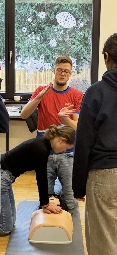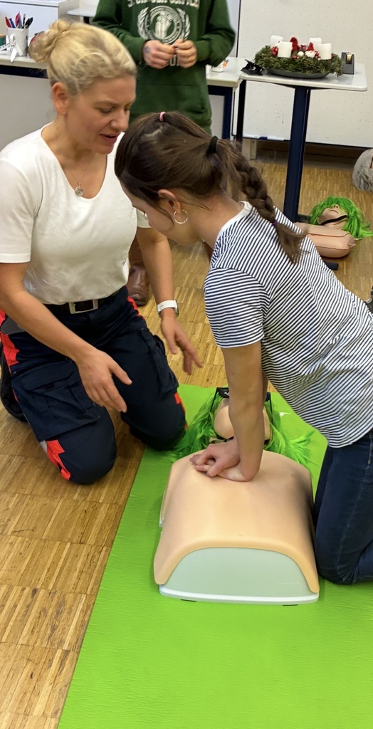 Am Mittwoch, vor Beginn der Weihnachtsferien, fand ein Reanimationstraining für die Klassen 5a, 6a, 7b, 8a und 9b statt. Frau Dr. Petra Hederer vom Notfallzentrum der Uniklinik Freiburg und ihr Team leiteten die Schülerinnen in der Herangehensweise einer Notfallsituation an. Die Klassen übten die stabile Seitenlage und lernten die so genannte „Laienreanimation“ kennen. Dabei geht es darum, Bewusstsein und Atmung zu prüfen, Hilfe zu rufen sowie den Notruf 112 zu wählen und dann ohne Zögern mit der Herzdruckmassage zu beginnen. Die Klassen waren sehr motiviert und konzentriert dabei. Das Lehrerteam war begeistert. Es ist geplant, dass im Verlauf des Schuljahres alle Schulklassen geschult werden. Wir freuen uns schon!Ein Hinweis von Frau Dr. Hederer für alle, die üben möchten: