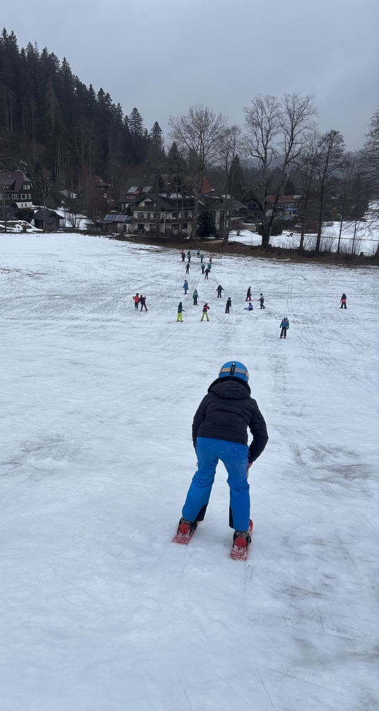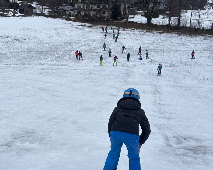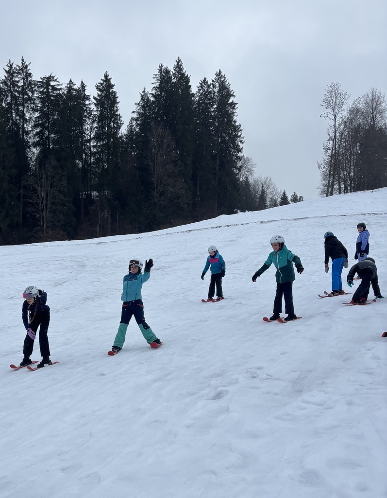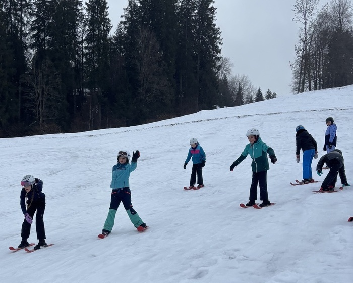Mit viel Freude und einer großen Portion Mut tobten sich die Schülerinnen der Klasse 5b im Schnee von Hinterzarten aus. Nach ersten vorsichtigen Schritten auf der Ebene wagten sich schließlich alle ans Mini­ski-Gleiten am Hang – und hatten dabei jede Menge Spaß.