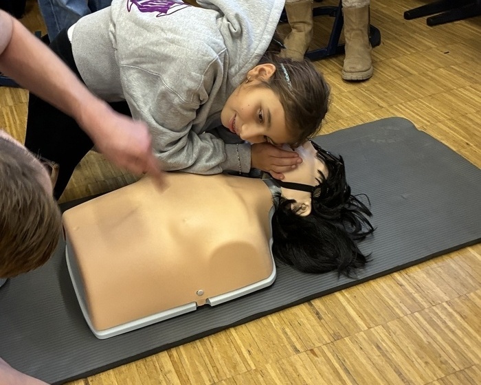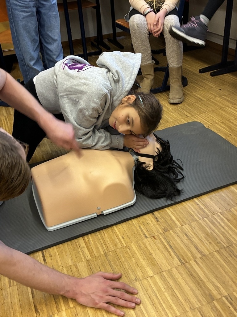 Am Mittwoch, vor Beginn der Weihnachtsferien, fand ein Reanimationstraining für die Klassen 5a, 6a, 7b, 8a und 9b statt. Frau Dr. Petra Hederer vom Notfallzentrum der Uniklinik Freiburg und ihr Team leiteten die Schülerinnen in der Herangehensweise einer Notfallsituation an. Die Klassen übten die stabile Seitenlage und lernten die so genannte „Laienreanimation“ kennen. Dabei geht es darum, Bewusstsein und Atmung zu prüfen, Hilfe zu rufen sowie den Notruf 112 zu wählen und dann ohne Zögern mit der Herzdruckmassage zu beginnen. Die Klassen waren sehr motiviert und konzentriert dabei. Das Lehrerteam war begeistert. Es ist geplant, dass im Verlauf des Schuljahres alle Schulklassen geschult werden. Wir freuen uns schon!Ein Hinweis von Frau Dr. Hederer für alle, die üben möchten: